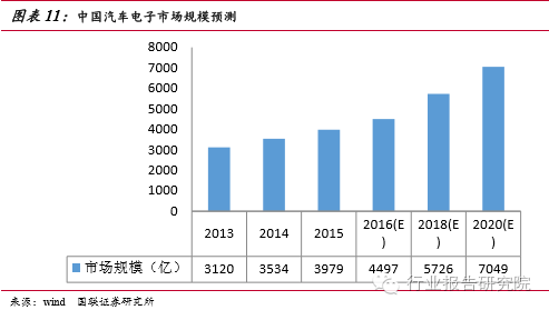 汽車電子類產(chǎn)品通常落后消費(fèi)類電子產(chǎn)品一個(gè)時(shí)期,正如過(guò)去幾年手機(jī)行業(yè)所經(jīng)歷的那樣,汽車業(yè)正在由“功能機(jī)”向“智能機(jī)”發(fā)展,這將給電子行業(yè)帶來(lái)新的增長(zhǎng)引擎。受惠于各國(guó)汽車安全政策加持,近期汽車電子輔助行車安全的趨勢(shì)已十分明確,越來(lái)越多類似TPMS、倒車影像、自動(dòng)剎車系統(tǒng)等新應(yīng)用崛起。各大車企、互聯(lián)網(wǎng)公司紛紛加快在車聯(lián)網(wǎng)和自動(dòng)駕駛領(lǐng)域的產(chǎn)業(yè)布局,車聯(lián)網(wǎng)有望成為第一個(gè)實(shí)現(xiàn)的物聯(lián)網(wǎng)應(yīng)用空間廣闊,存量與增量汽車市場(chǎng)規(guī)??捎^。2015 年中國(guó)汽車電子市場(chǎng)規(guī)模為3,979億元,同比增長(zhǎng)12.6%,2013~2015年中國(guó)汽車電子市場(chǎng)規(guī)模平均增長(zhǎng)率為13.7% 。中商產(chǎn)業(yè)研究院預(yù)測(cè)2016年中國(guó)汽車電子市場(chǎng)規(guī)模為4497億元。賽迪顧問(wèn)預(yù)計(jì)到2016年中國(guó)汽車電子市場(chǎng)將保持 10%以上的增速,同時(shí)汽車電子在整車成本中的占比將超過(guò)50% 。我們判斷中國(guó)汽車電子市場(chǎng)增長(zhǎng)方式正在由汽車產(chǎn)量增長(zhǎng)轉(zhuǎn)向功能需求驅(qū)動(dòng)。